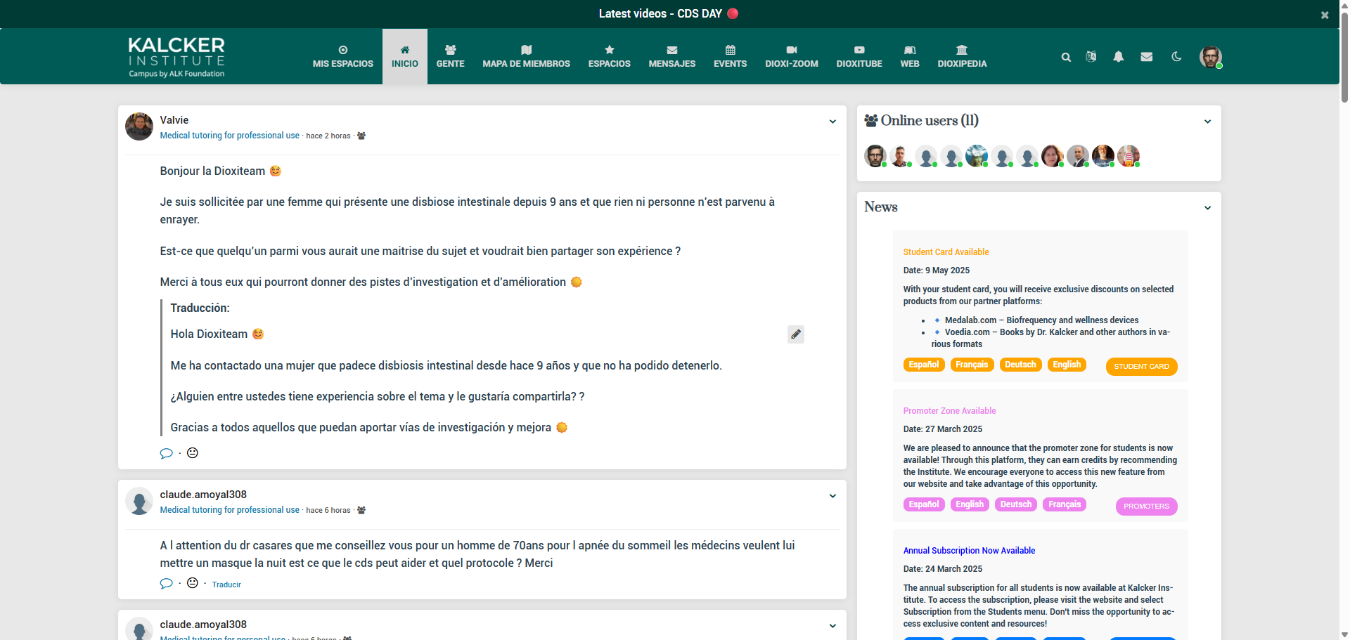 Al entrar en el Campus Virtual descubres un espacio diseñado como una gran red social académica. Puedes publicar dudas, compartir artículos o lanzar encuestas y recibir respuestas en cuestión de minutos. Gracias al sistema de traducción integrado, cada mensaje se muestra en el idioma del lector, lo que facilita la conversación entre estudiantes de distintos países sin barreras lingüísticas.